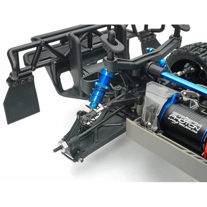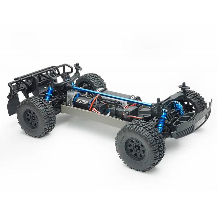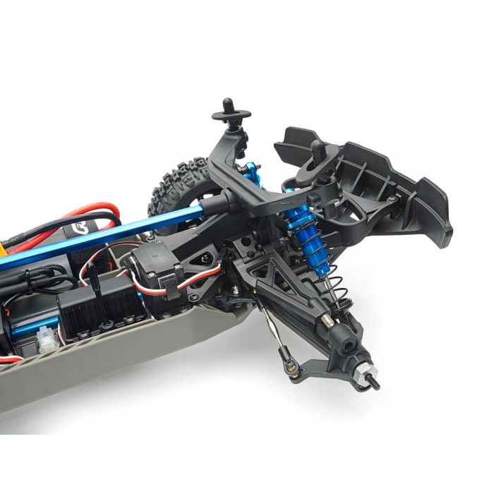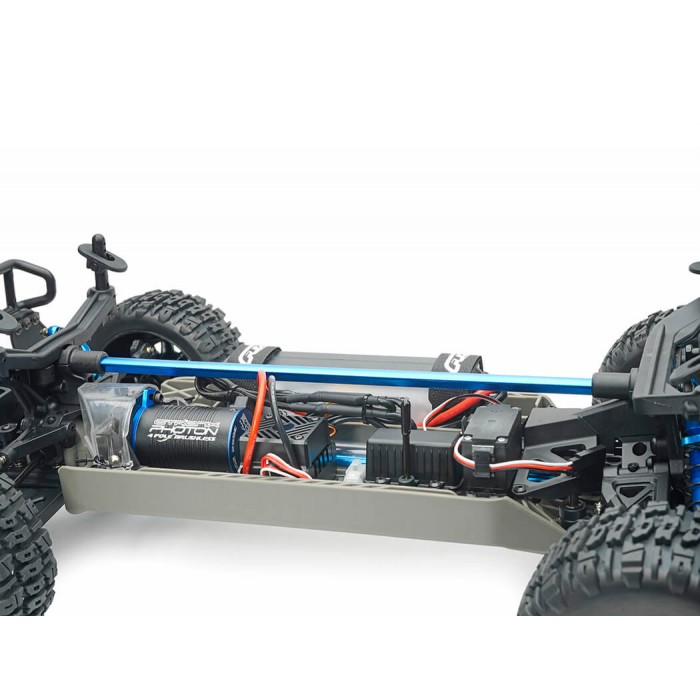 The Apache’s high ground clearance moulded tub chassis is now reinforced front-to-rear with an aluminium T-brace for near-zero chassis flex, while aluminium skid plates and updated moulded bumpers add extra protection for hard off-road running. Long-travel suspension has been strengthened with revised arms and a new rear upper link, supported by blue anodised aluminium oil-filled shocks at each corner.