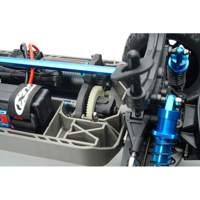 Powering the sealed, shaft-driven 4WD system is a Voltz 3S LiPo battery, Hobbywing 50A speed controller now with XT60 connectors and an Etronix 2500Kv brushless motor, providing exhilarating high-speed performance across dirt, gravel, and rough terrain.